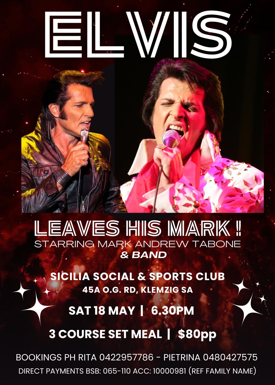 Sicilia Social & Sports Club 45A O.G. Rd, Klemzig"Elvis is in the Building!" Come and watch "Elvis" at the Sicilia Club. See Mark Andrew Tabone perform his tribute show to "The King". You ticket entitles you to a set 3 course meal and show. Drinks can be purchased from the bar. Strictly No BYO. Bookings essential and payment is expected soon after confirming...